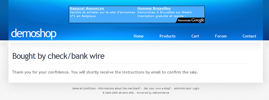 Payment chosen here is a bank wire, so he is directly redirected to a confirmation page and receive information by email to make payment.